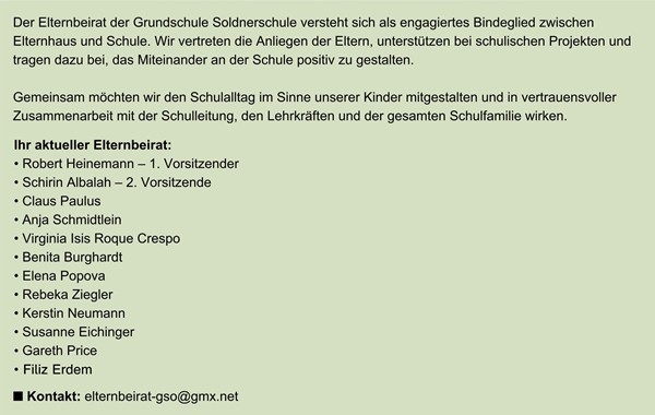 Viele Eltern engagieren sich nicht (nur) als Klassenelternsprecher bzw. Elternbeirat, sondern sind im Förderverein unserer Schule aktiv. Da Förderverein und Elternbeirat der Grundschule Soldnerstaße sehr gut zusammenarbeiten, finden wir hier einen weiteren Baustein eines intakten Schullebens wieder.